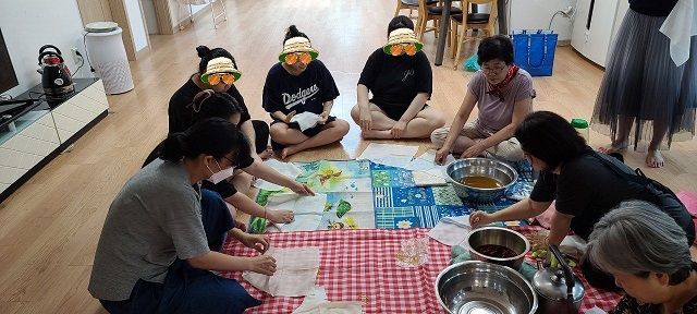 행복학교 행복시민봉사자와 함께 아기가 사용하게 될 손수건을 염색하기